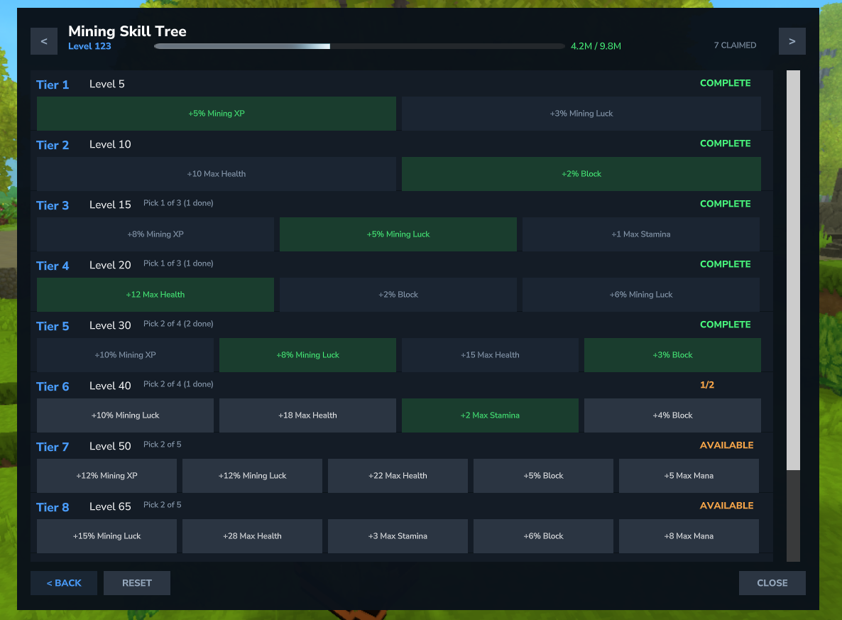 Skill Tree page showing reward tiers with locked, available, and claimed statuses